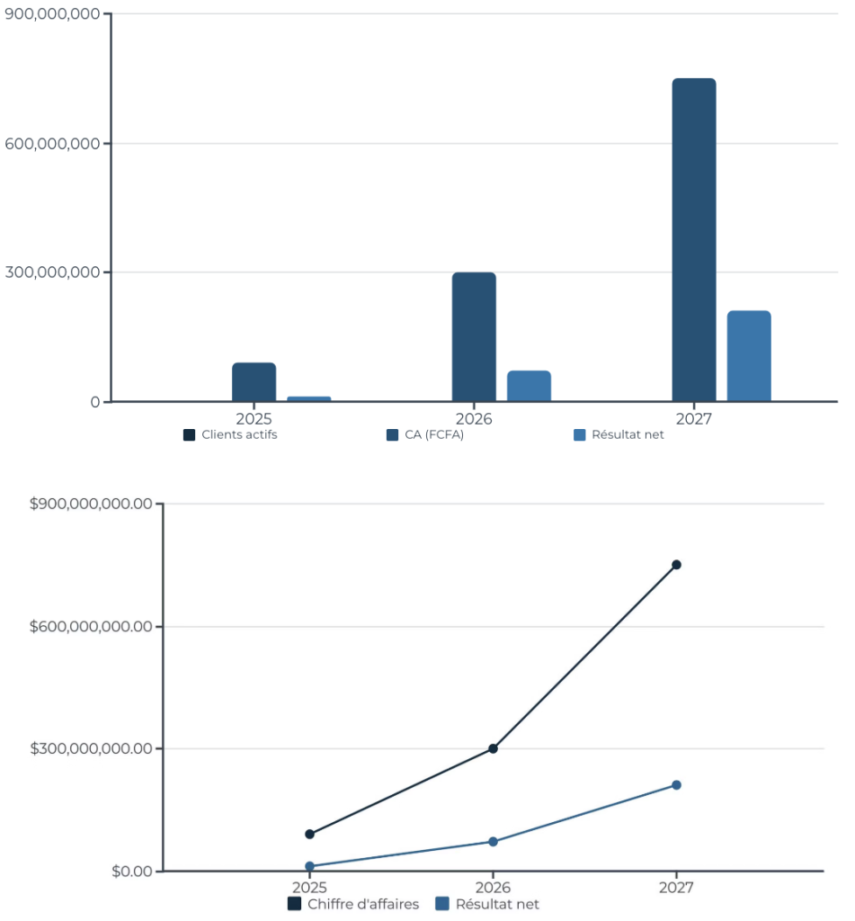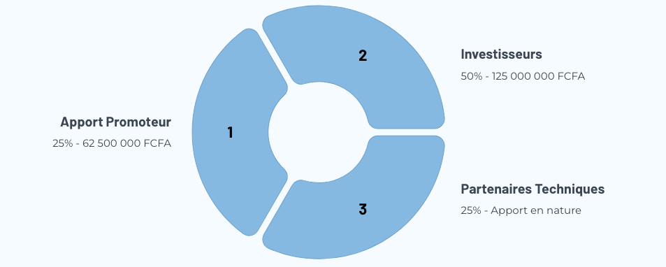 Nous recherchons un investissement total de 250 000 000 FCFA (environ 400 000 USD) pour financer le déploiement pilote et la montée en charge commerciale. Cette structure de financement équilibrée garantit l’engagement de toutes les parties prenantes.